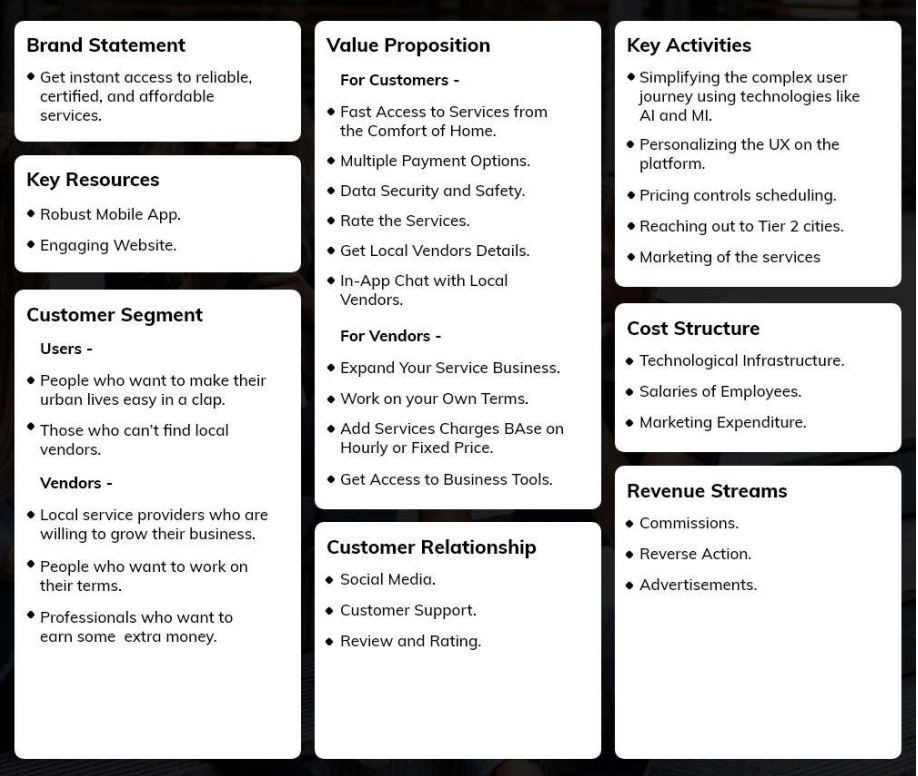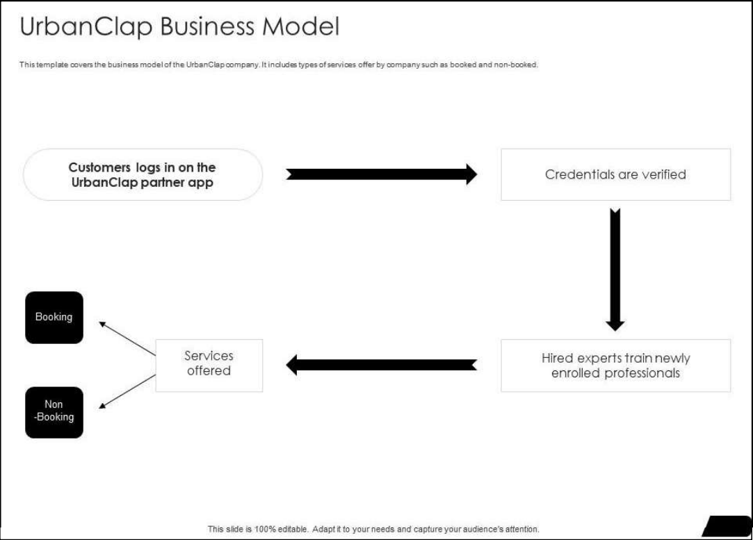 UrbanClap is a platform that connects customers with service professionals. Customers log in to the app and book services, which are then verified by the company. The company also trains newly enrolled professionals to ensure quality service delivery.